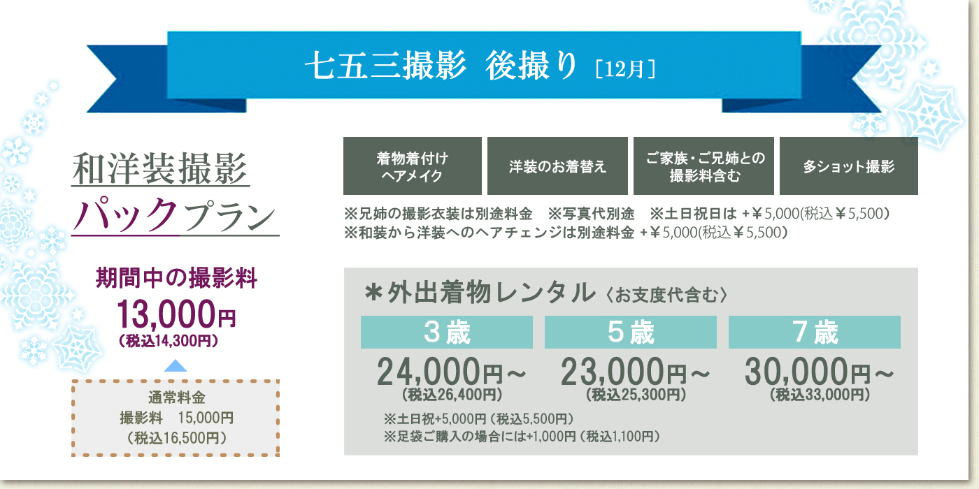 すべて当店にお任せくださいスタジオで撮影をしたら、そのまま神社へ七五三のお参りへ。また、前撮りを利用すれば、お参り当日は余裕をもってお出掛けすることも。素敵な和装で、家族と楽しくお出掛けください。