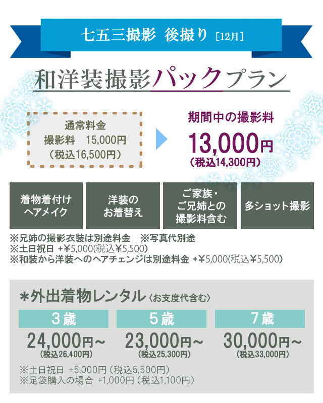 すべて当店にお任せくださいスタジオで撮影をしたら、そのまま神社へ七五三のお参りへ。また、前撮りを利用すれば、お参り当日は余裕をもってお出掛けすることも。素敵な和装で、家族と楽しくお出掛けください。