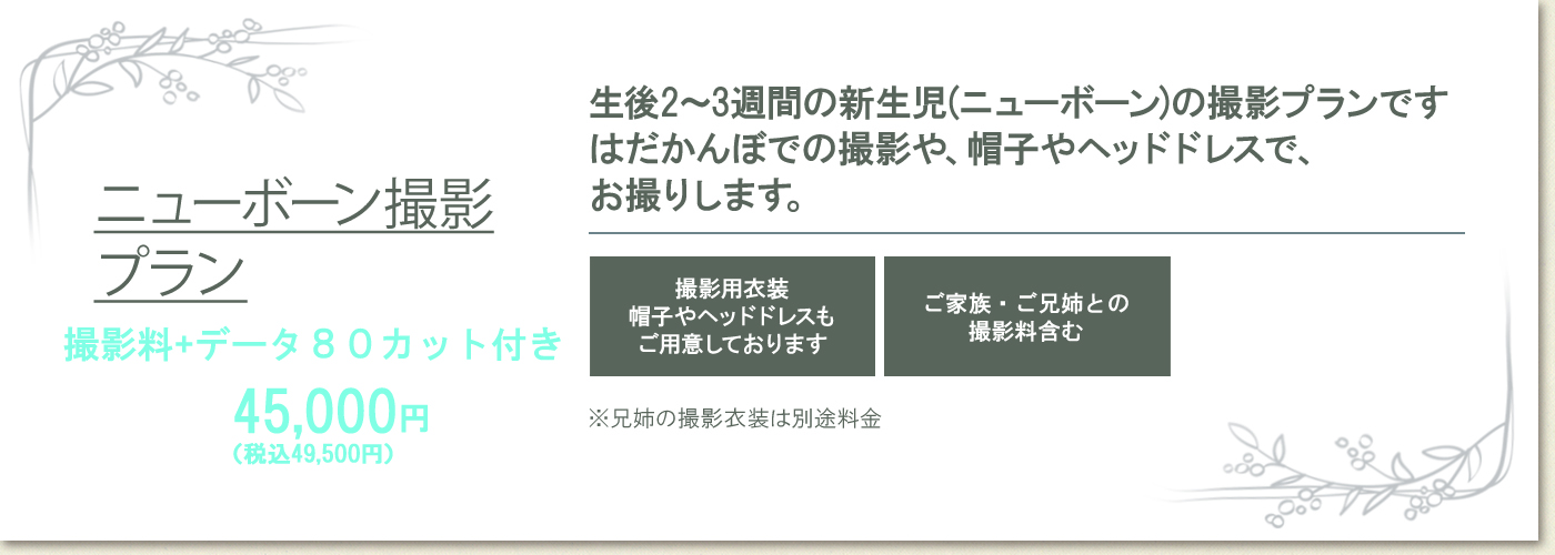 赤ちゃんがお母さんのお腹の中にいたころの状態に近い、生後3週間までに撮ることをお勧めしています。 写真を見返すと、出産したときの幸せな気持ちを思い出させてくれるニューボーンフォト。必ず撮っておきたい貴重な瞬間です。